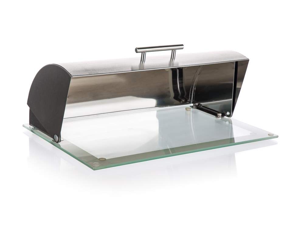 Nerezový chlebník GRANDE GLASS o rozměru 39 x 28,5 x 14 cm se skleněným dnem slouží k uchovávání všech druhů pečiva. Povrchová úprava mat, typ nerezové oceli: 430, síla nerezi 0,4 -0,6 mm.
