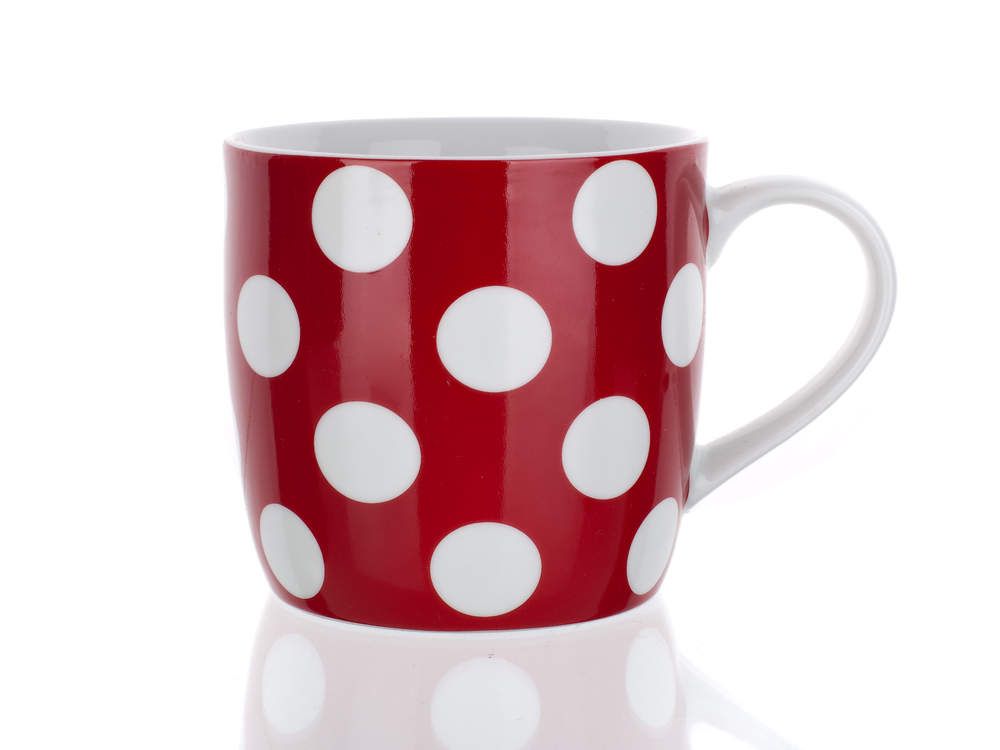 Hrnek o objemu 310 ml v červené barvě s puntíky, je vyrobený z keramiky, vhodný pro podávání studených a teplých nápojů. Výška hrnku 8,9 cm, průměr horní 8,9 cm a průměr dolní 7 cm. Hrnek lze používat do mikrovlnné trouby a mýt v myčce na nádobí.