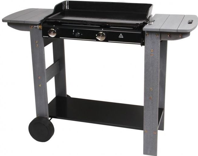 Plynový gril Cambo s veľkou liatinovou grilovaciou platňou. Gril má 2 nerezové horáky v tvare U s elektronickým zapaľovaním.